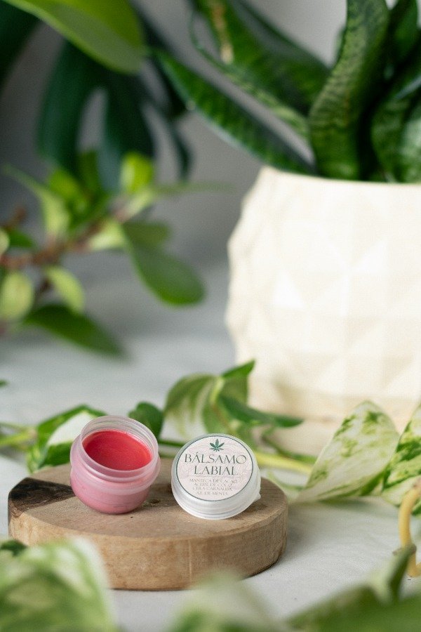 Ingredientes del balsamo: aceite de coco, cera candelilla, y manteca de cacao, mica cosmetica, con aceite escencial de menta.